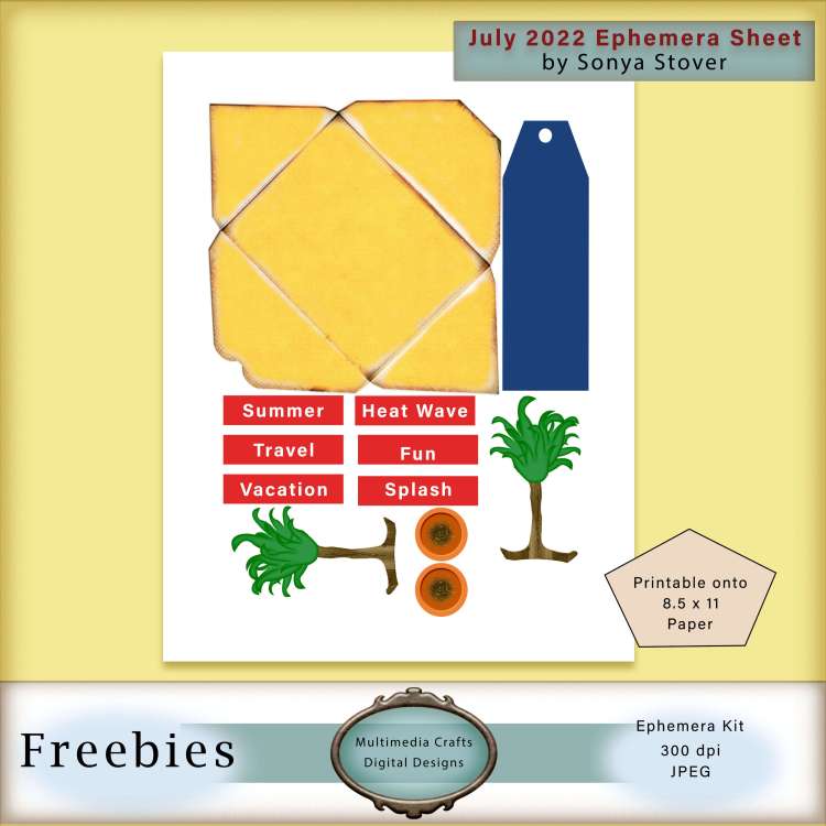 You can use some Freebies to add in with your work. Enjoy the Multimedia Crafts Digital Freebie called, “July 2022 Ephemera Sheet.” It includes an envelope, words, a tag, and some cut outs. Your project would also look good with the other Multimedia Crafts Digital Facebook page Freebie called, “Summer.” To access the Multimedia Crafts Digital Facebook freebie, go to the Facebook page then “More”, “Photos”, “Albums”, and then scroll down to find the kit you want to download. Click the photo and then click the corresponding download link.