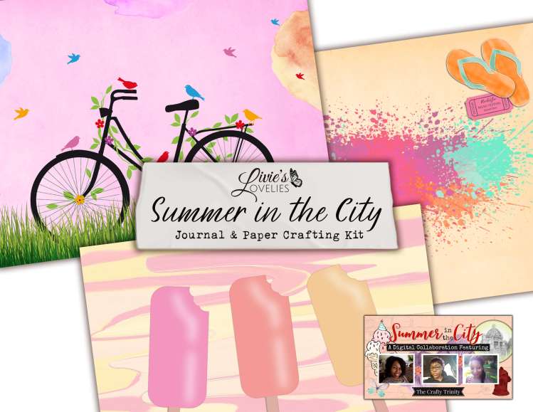 In my journal I used both of the Multimedia Crafts Digital blog and Facebook page freebies. I also used the new digital kits from a collaboration I participated in. There is a trio of us ladies who call ourselves, “The Crafty Trinity.” We are comprised of myself, Sonya Stover, the fabulous Pham from “Livie’s Lovelies” and Thelisha from “The Sweets by Thelisha”. We have each developed a summer, travel themed journal kit titled, “Summer In the City”.