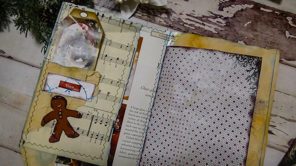 For my project, I made a one signature journal using glitter, Glossy accents, a doily, and cheesecloth. Added some old book pages, music sheets, vintage papers and more to give the folio an eclectic, yet nostalgic holiday feel. I used both of the Multimedia Crafts digital blog and Facebook freebies, as well as the new, “Christmas Charm” Etsy digital kit. Enjoy the photos of my project below.