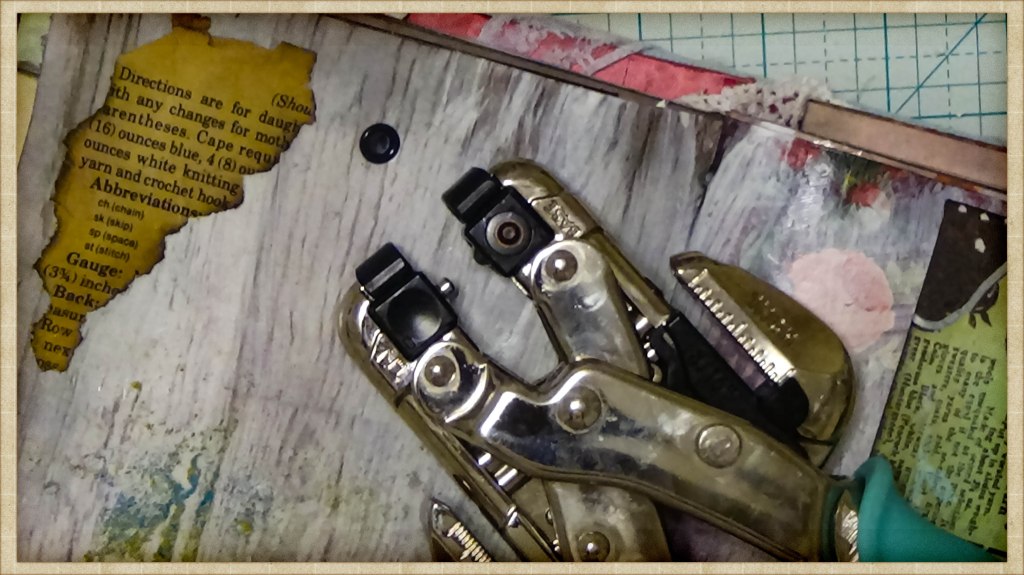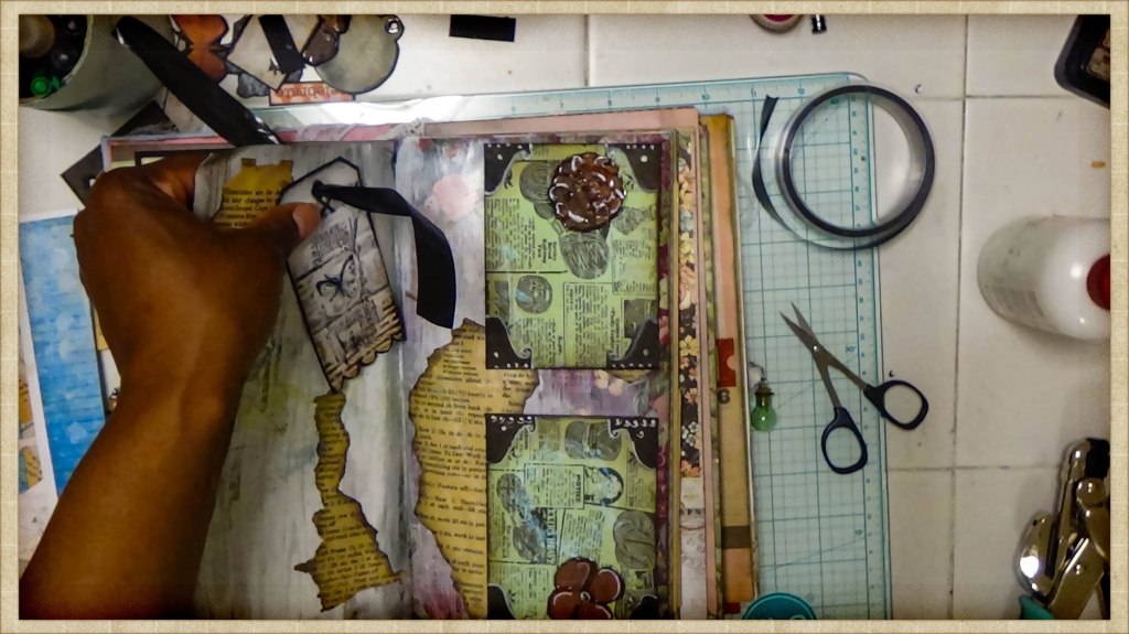 On the left page I punched a hole in the top using my Crop a dile tool and added an eyelet. I wanted to secure the hole so that the ribbon wound through it would remain strong as it held the tag that I placed there as a tuck spot.