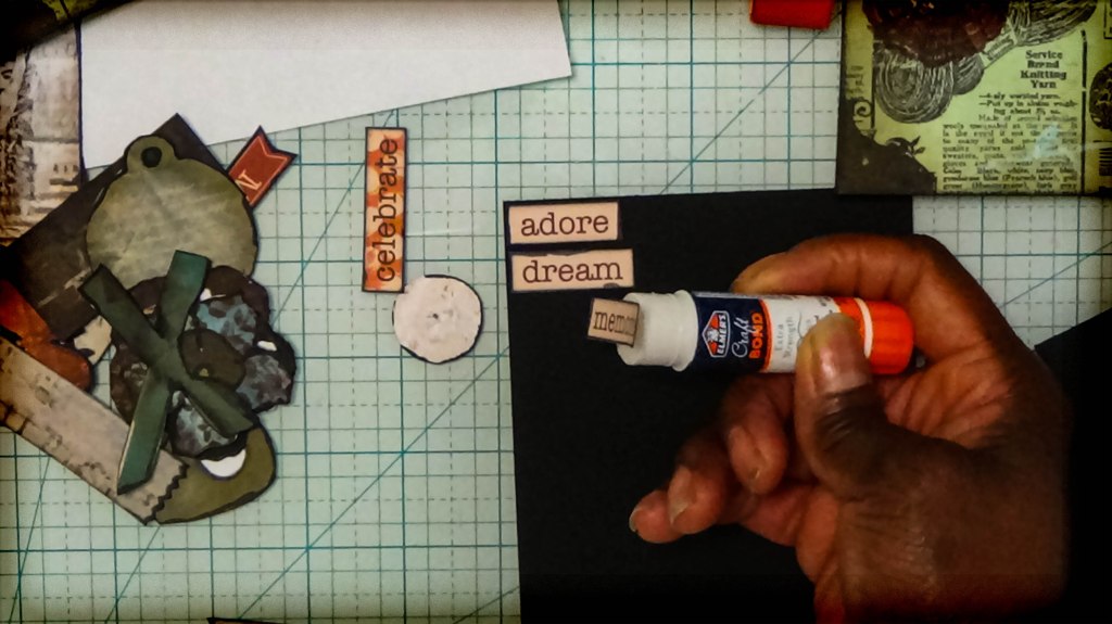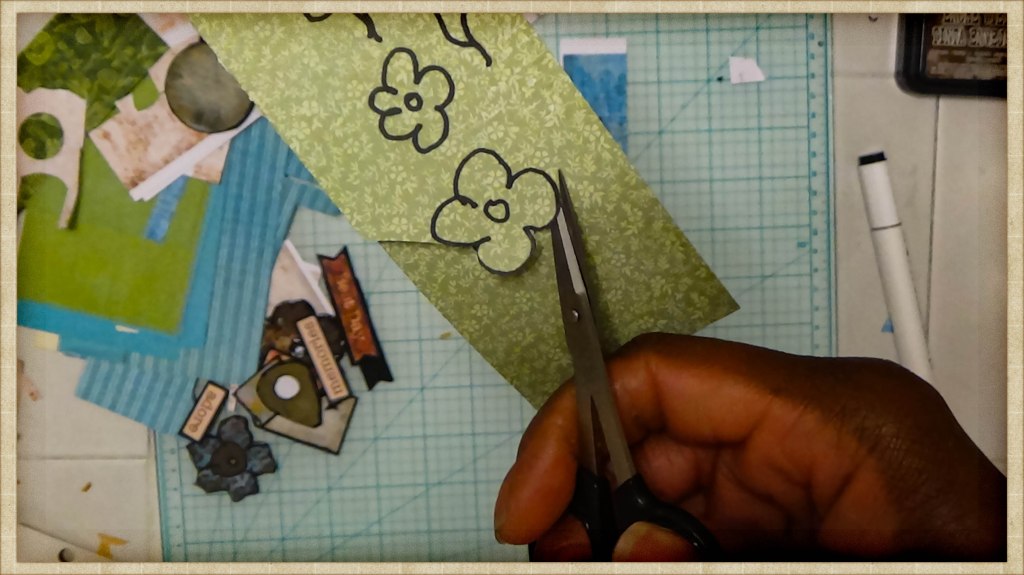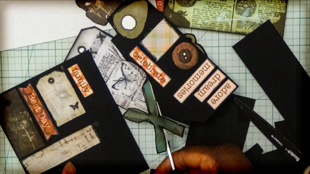 I used text from the ephemera sheet on the Facebook Freebie, “Aged Stamps” along with other cut out embellishments for the rest of the project.