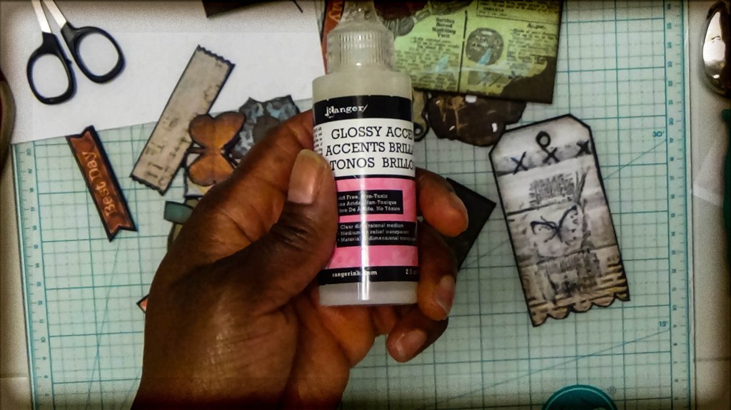 Next I sealed the colors on both pages in using Liquitex Professional Gloss Super Heavy Gel. This technique also helps stop fine particles from the embossing powder from wiping off the pages.