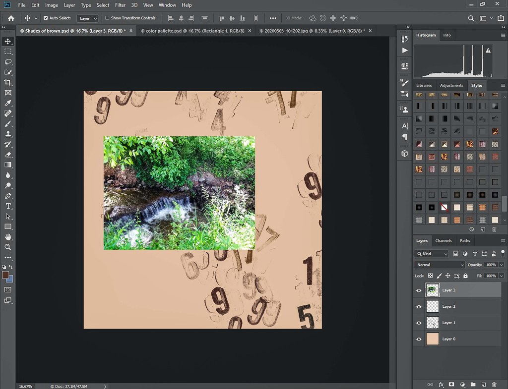 Next, I added a picture as my focal point and began to build around it. I added some elements and papers from the Pixel Scrapper collaboration bundle called, “The Good Life Bundle“. I used the Kit from that bundle called, “Autumn Bramble” by Jessica Dunn. I made sure to use the color pallette to alter the tones to shades of brown.