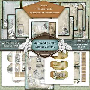 In the photo at the beginning of this blog, I added some elements from the freebie kit and developed a fallish, Thanksgiving layout. But, I was also able to create some hybrid crafts as well using the same kit. In the slide show below I used a combination of the freebie digitals as well as the “Warm Harvest” digital kit found on the “Multimedia Crafts Digi” etsy shop. I coupled the images with downloaded papers, and stitched on fabrics and scrap pieces from my stash.