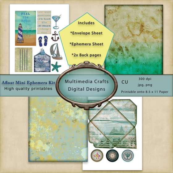 Some of the embellishments were from the Multimedia Crafts Digital Etsy shop. I used the kit found in the $1 Deal section called, “Afloat Mini Ephemera Kit.”