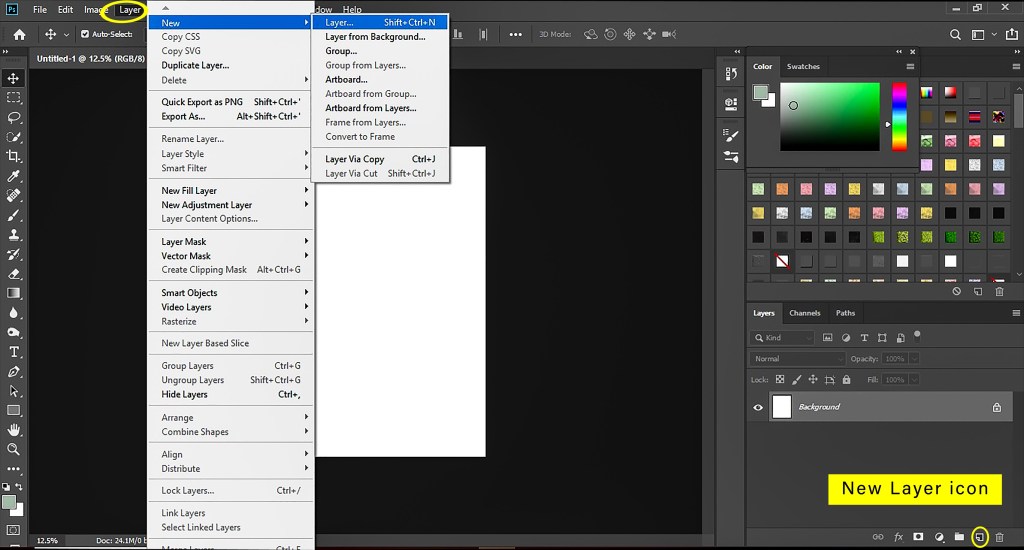 When the document opens, the background layer is automatically white, and it is locked. I’m then going to add a new layer in the “Layers” Panel to the right. You can do this by either clicking on the “new layer” icon at the bottom right of the Layers Panel, or by clicking “Layer”>”New”>”Layer” on the menu bar at the top, or by using your keyboard shortcuts “Shift+Ctrl+N” on a PC or “Shift+Command+N” on a MAC. I will label this background because the original white background layer will get deleted at the end of the design.