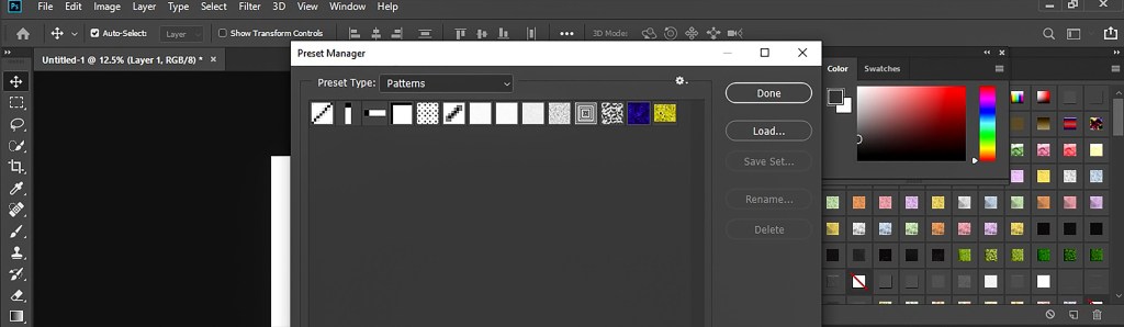 Once the new layer has been created, we will begin to design the pattern. There are a few ways of accessing your patterns library. A very common method is by going to the menu bar and clicking “Edit”> “Presets”> “Preset Manager”. The Preset Manager panel opens. Using the drop-down options, you can choose the “Type” of preset you want. In this case we want “Patterns”. The files in the “Patterns” library appear. You can see what is already loaded. You can also access your Patterns another way.