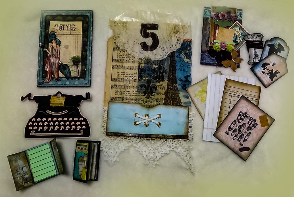 I like to use a combination of them, along with junk mail, envelopes, paper bags, tea and coffee stained papers, doilies, tickets, vellum, old sheet music pages, glassine bags, old book pages, fabric, lace, and much more. I also accent them with tags, folios, tuck spots, jewelry and other elements.
