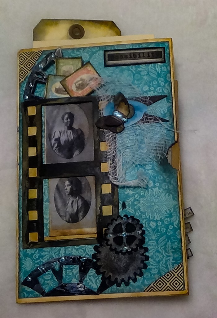 Front of junk journal folio with die cut gears, filmstrip, and picture wheel shapes