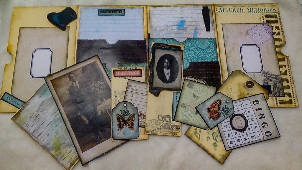 You, of course, could omit some of those and add other ephemera to your books. I just like to have various elements in each one of my designs. I get them by collecting advertisements from the postal “junk” mail, online blogs, eBay (bulk supplies for auction) Amazon, Etsy, and other websites that offer free digital downloads. (Disclaimer: If you click on the eBay link and make a purchase, I will receive a percentage from your order).